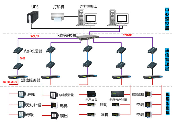 智能化供配電系統從結構來看都可分為三層:現場I/O、通訊管理層和中心控制層。其中,控制層是整個系統的控制核心,監測和控制供電系統的運行,同時也可用于人-機對話的界面、數據處理和存儲管理;現場I/O則用于現場設備狀態信號和運行參數的采集,對現場設備進行控制操作。