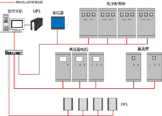配電室中通常設置兩臺變壓器、不間斷電源EPS、UPS、直流屏和高、低壓配電柜若干面。通常在配電柜上配置電力儀表進行終端數據采集。