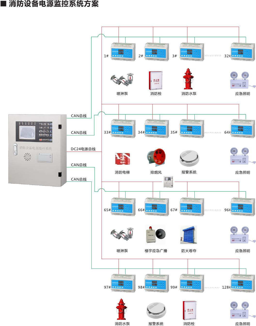 用于監控消防設備電源工作狀態,在電源發生過壓、欠壓、過流、缺相、中斷供電等故障時能發出報警信號的監控系統,由消防設備電源狀態監控器、中繼器(區域分機)、電壓傳感器、電流傳感器、電壓/電流傳感器等部分或全部設備組成。